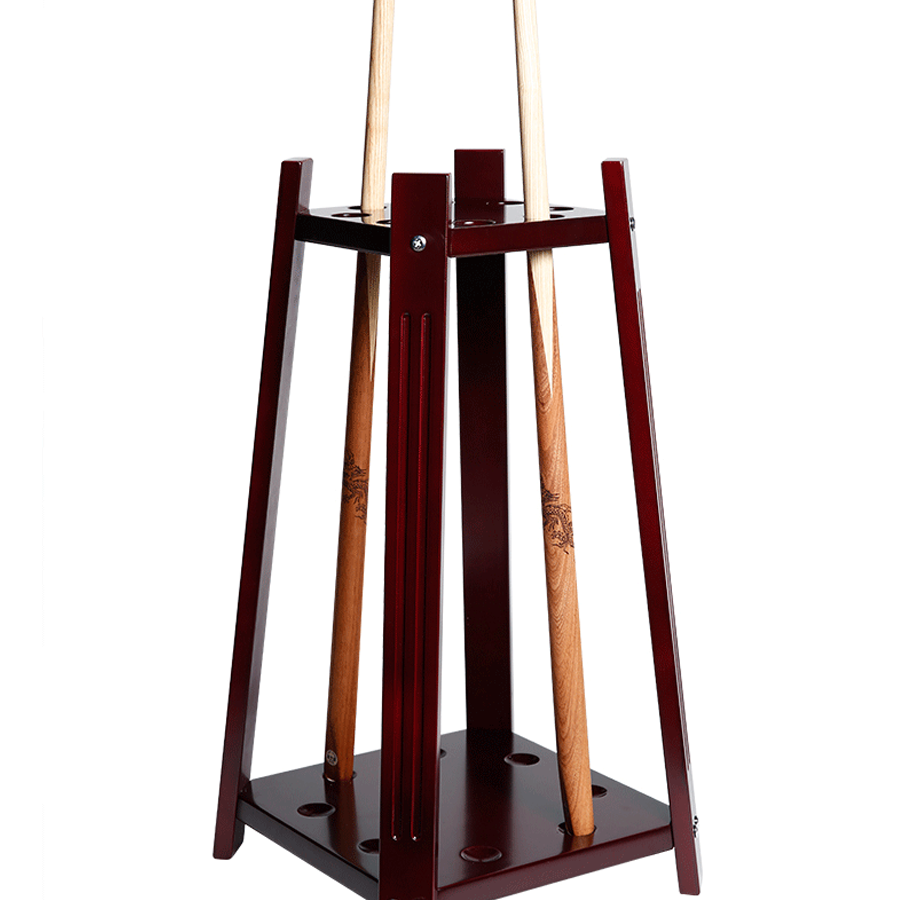 台球杆架子由于台球杆架设有保护层,能够有效的避免因长期磨损使球杆表面造成损伤,能够延长使用寿命,然后就是设有伸缩杆、万向轮,让使用者能够移动伸缩使用,由于设有螺纹槽与螺纹块能够方便安装拆卸,结构简单,实用性强,适合广泛推广